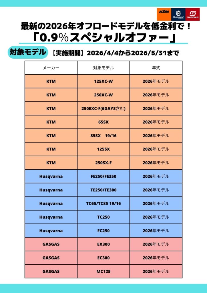 KTM/HusqvarnaMotorcycles/GASGAS 「0.9%スペシャルオファー」 2026.04.09 未分類 Tweet Share Hatena Pocket RSS feedly Pin it この記事のタイトルとURLをコピーする 皆さまこんにちは♪ KTM/HusqvarnaMotorcycles/GASGAS KASHIWA です。 2026年モデルのオフロードモデルがお得に買えるキャンペーンのお知らせです。 Tweet Share Hatena Pocket RSS feedly Pin it KTM「0%スペシャルオファー」開催! 前の記事